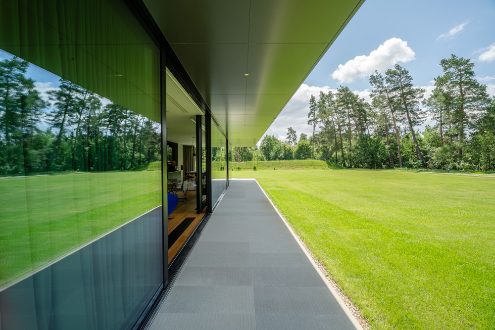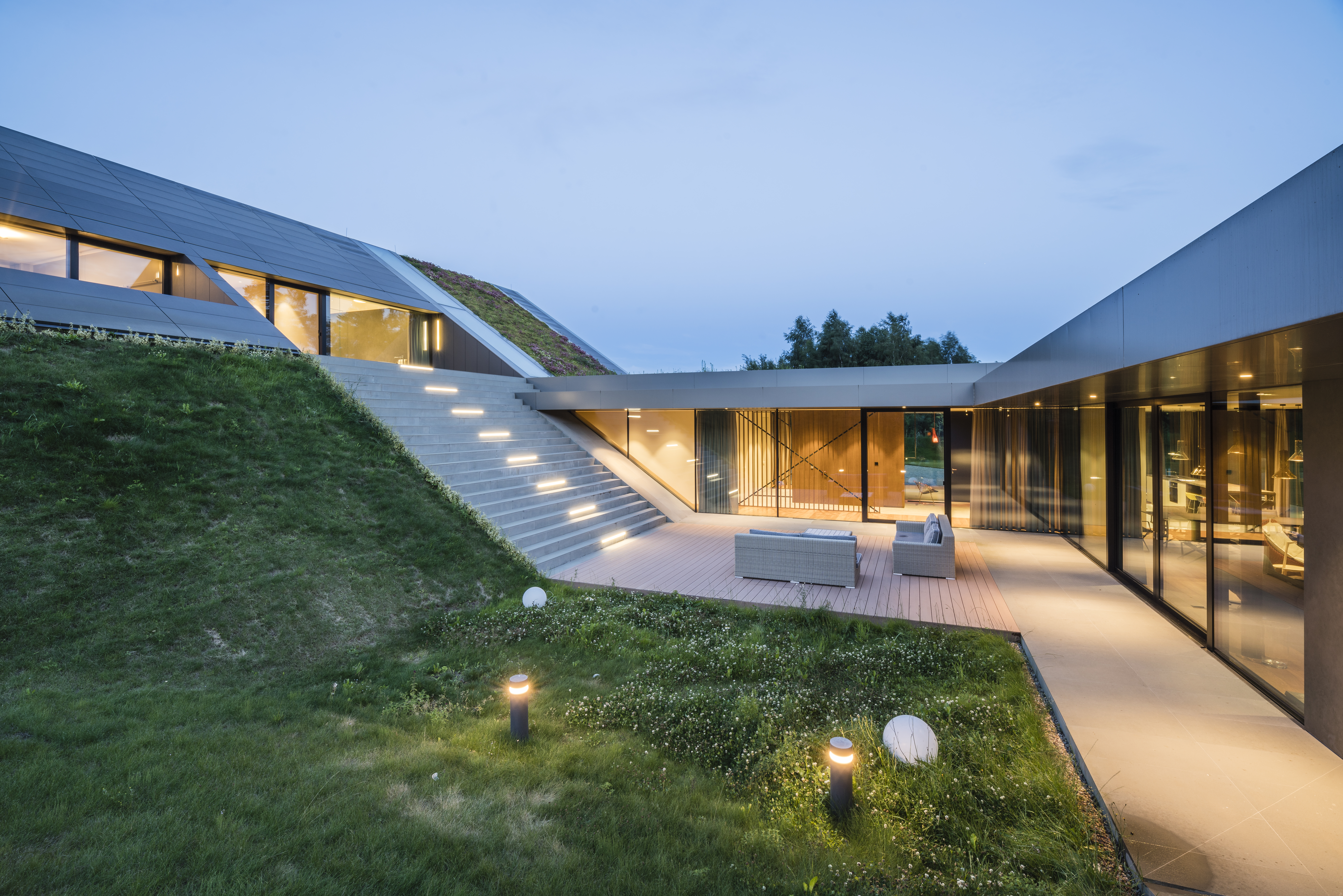 Żelbetowa płyta wsparta ustrojem słupów wyprowadza czytelne strefowanie domu na cześć dzienną - parterową i górną - nocną. To ona nadała charakterystyczny, horyzontalny układ budynku, którego odbiór wzmocniony jest linią zielonego dachu, przesuniętego względem parteru. Dzięki temu patrząc na dom można odnieść wrażenie powstałej w sposób naturalny, poziomej szczeliny ziemnej, otwierającej się w kierunku jeziora. Dzięki umiejętnemu wpasowaniu architektury w strukturę działki dom mający ponad 500 m kw. nie przytłacza skalą. Manifestacyjne potraktowanie zewnętrznych schodów, charakterystyczne bardziej dla obiektów użyteczności publicznej niż domów jednorodzinnych, tworzy ciekawy detal architektoniczny.